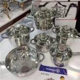 سرویس پخت و پز کرکماز تمام استیل کف چدن دارای دو عدد تابه تک دسته و 4 عدد قابلمه در سایز مختلف توجه کنید در مورد سفارش این محصول دسته هاش سه رنگ دارد و دسته طلایی ، دسته برنز و دسته استیل تنوع رنگ استیل و نقره ای مربوط به قابلمه دسته استیل میباشد تنوع رنگ طلایی برای سرویس دسته طلایی و تنوع رنگ برنز برای سرویس دسته برنز میباشد. تابه بزرگ داخل تفلون میباشد ساخته شده از استیل 18/10 قابلمه ها در سایز های 24,20,18,16 میباشد تابه ها در سایز های 24 و 16 یک عدد پیش بند و دو عدد دستکش پارچه ای و یک عدد کفگیر چوبی داخل جعبه قرار دارد توجه کنید جنس ها کاملا مطابق تصویر بوده و جنس اصلی هستند.