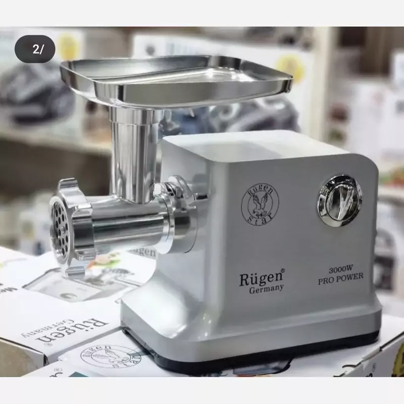 چرخ گوشت 3000 وات روگن مدل RU-1310 دارای گیربکس جدید و کاملا فلزی دارای رابط های کاملا فلزی و مقاوم دارای اهرم قفل کننده فلزی دارای بدنه کاملا تیتانیومی دارای پنل عقربه ای 2 سرعته به همراه دور برگردان دارای 18 ماه گارانتی روگن سرویس ساخت روگن آلمان www.rugen.co