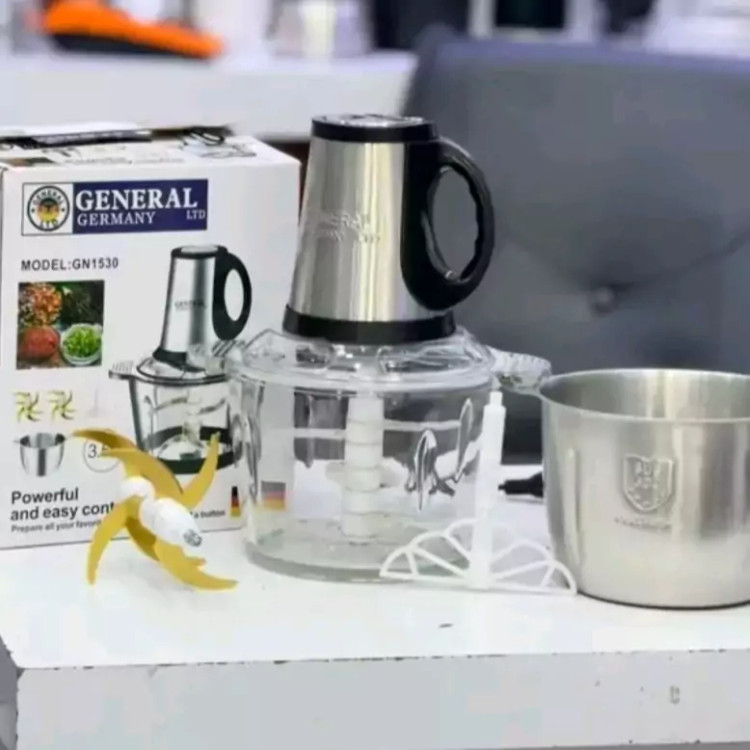 خرد کن جنرال GENERAL اصل دو کاسه مدل 1530 موتور سیم پیچی فشرده مسی تعدا كاسه 2 عدد استیل و شیشه پیرکس دسته آرگونومیک موتور جنس تیغه تیتانیوم یک دسته تیغه 6 عددی یدکی و اضافی یک همزن پایه ضد لغزش سه سرعته و دکمه عملکرد پالس